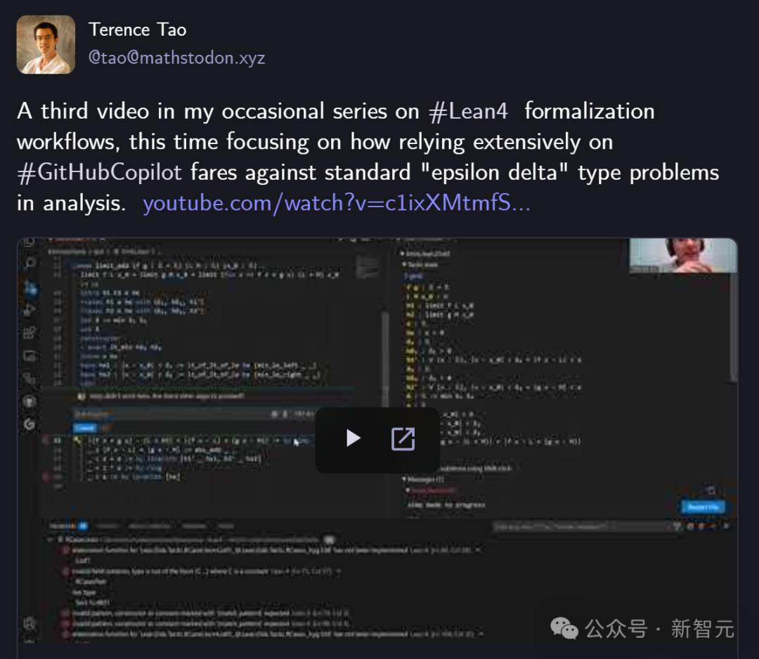 第三支Leann大师陶哲轩 4自动数学证明视频来了!他与GitHub携手 Copilot挑战分析经典「ε-δ」极限问题:加法定律Copilot可以自由挥洒,减法开始卡住,乘法完全失控。Copilot是上帝的助攻还是混乱?
