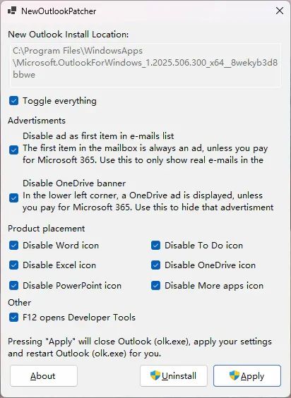 NewOutlookPatcher 可以直接禁用应用内广告,包括左下方 OneDrive 条幅、Web 版 Office 桌面图标等,同时也可以 Outlook 应用内打开 F12 开发工具。操作也很简单:直接检查需要处理的项目,然后单击 Apply 即可给 Outlook for Windows「打补丁」。