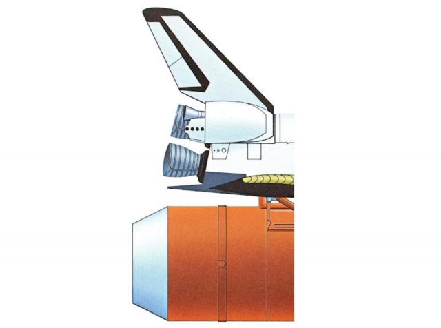为了提高有效载荷体积,他们建议在航天飞机外部燃料箱底部安装一个运输舱。运输舱的直径 8.4 米,长度 9.7 米。