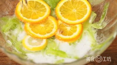 7. 橙子切 3~4 片,柠檬切 2~3 片子备用,剩下的挤汁加入配有苦瓜的碗中。