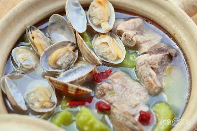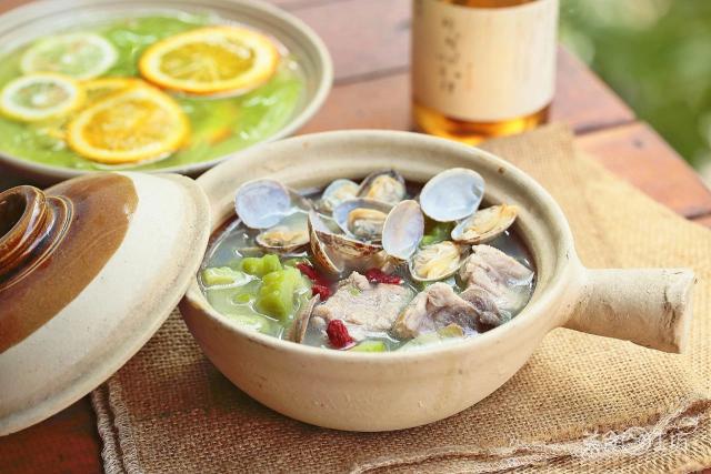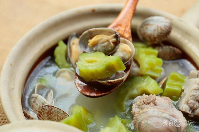 5. 将苦瓜与蛤蜊一起加入,继续炖煮 10 一分钟就可以了。饮用时根据自己的口味加盐调味即可。