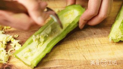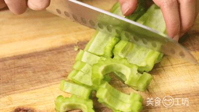 1. 把苦瓜切成两半,把种子和白肉挖出来。尽量去干净一些,可以削弱苦味,然后切成块备用。