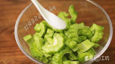 2. 加 1 将小勺盐混合均匀,腌制 20 分钟,出水后再用清水冲洗一遍。这能去除一些苦瓜的苦味,炖出来的汤也更新鲜。