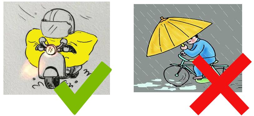 骑电动自行车或自行车时不要使用雨伞。单手骑自行车容易失衡。最好的办法就是穿上五颜六色、显眼的雨衣,让其他车辆和行人更容易注意到。同时,骑电动自行车时,要规范佩戴安全头盔,防止摔倒伤头。