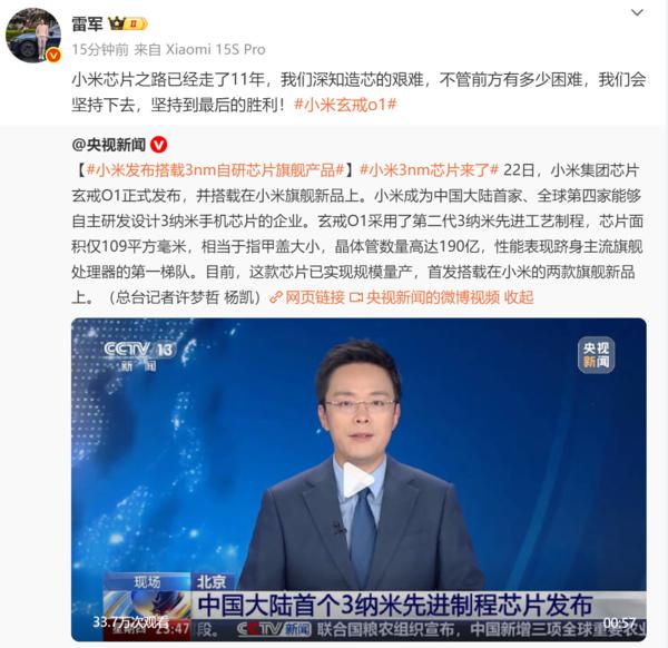 【CNMO 科技消息】5 月 22 当天晚上,小米召开了新闻发布会,正式带来了自研 Soc 芯片玄戒 O1。新闻发布会结束后,央视新闻也报道了这一事件,而小米创始人雷军一大早就分享了。