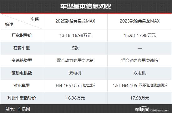 2025 款哈弗枭龙 MAX 共推出 5 配备车型,售价区间为 13.18-16.98 万元。2023 车型现在已经不在售了,当时只推出了。 3 款式配置,数量方面不如数量方面 2025 款车丰富。虽然价格有一些差异,但这次选择的对比车型仍然是顶级版本,以便更直观地看到新老车型在配置上的具体差异。