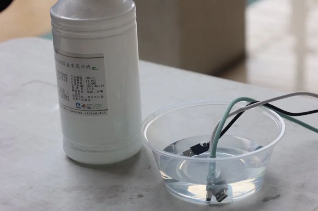 接下来,工作人员还对充电线进行了盐雾测试(一种环境测试,用于评估产品或金属材料的耐腐蚀性)。结果表明,优质充电线的外观几乎没有变化,而劣质充电线腐蚀严重,内部触点生锈。可见劣质充电线更容易被腐蚀,导致接触不良或短路。