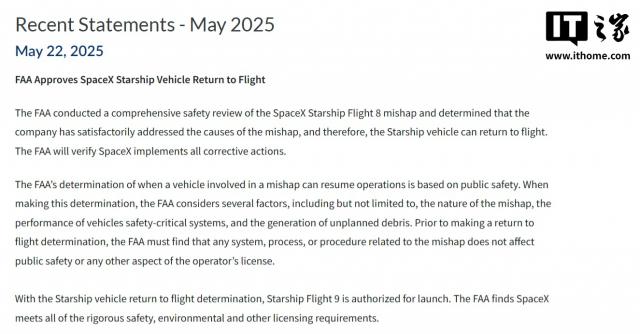 FAA 宣布完成以往事故调查,SpaceX 正式批准星舰第九次试飞任务。