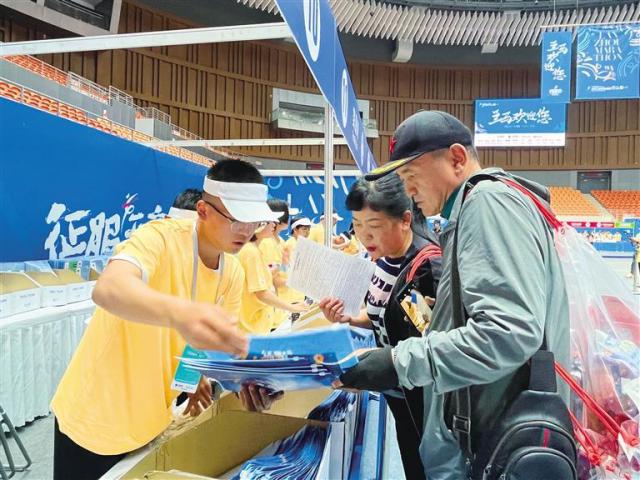 青年志愿者向参赛者发放材料
