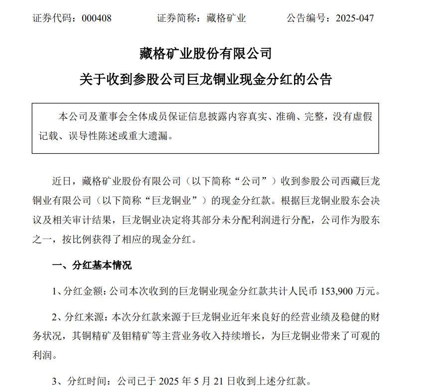 5月22日晚,藏格矿业(000408)宣布,该公司收到巨龙铜业的现金分红,共计15.39亿元。分红来自巨龙铜业的经营业绩和稳定的财务状况,对公司未来的经营业绩产生了积极的影响。