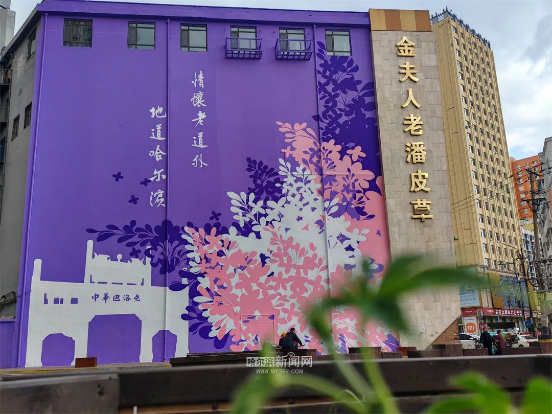 “中华巴洛克街区越来越受欢迎,越来越多的游客经过我们的地区。我们也想为地区发展做出一些贡献。”周边金太太老潘皮草负责人表示,因此,公司对原有墙绘进行了升级改造,整体色调以“丁香紫”为主,融入市花和地标,突出“感情老套” 以地道哈尔滨为主题,由专业团队在5天内完成,帮助环境“美”,创造新的文化旅游景观。