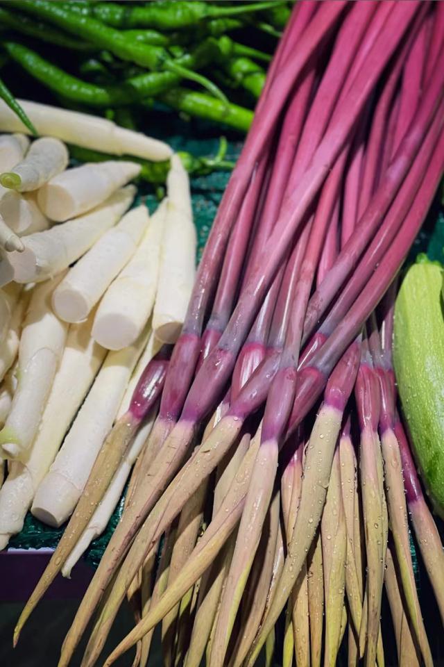在如霞如雪的花海中,一直垂着头的香蕉花更像是一种水果,吃起来有点苦。紫色的花瓣被仔细打碎,里面是细嫩如玉的黄白花芯。它们被细长的相互包围,用微甜的香味证明了它们的价值。