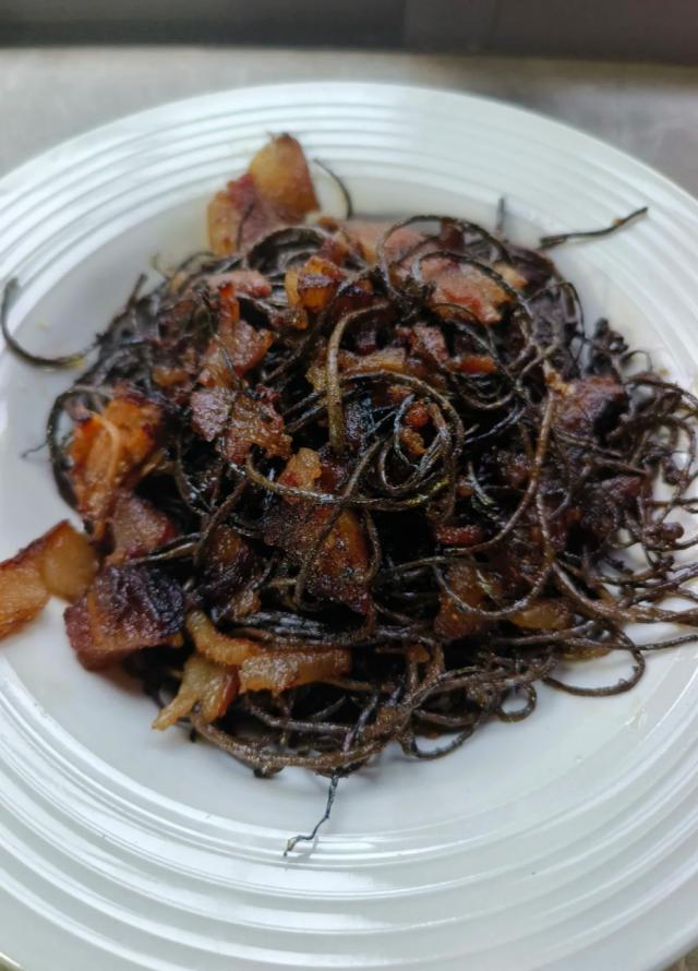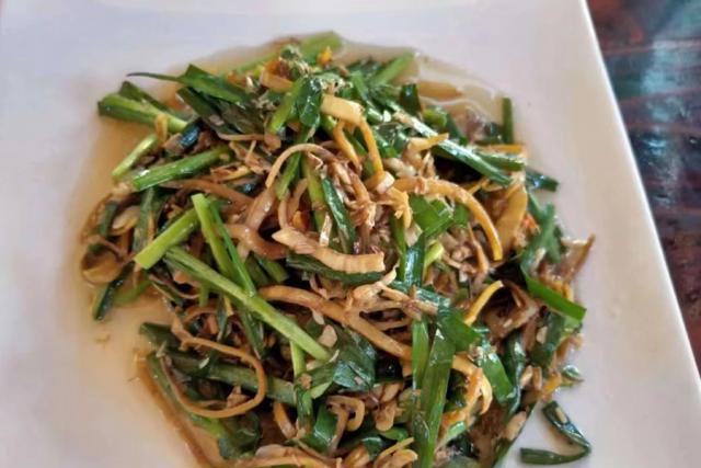 腊肉下热锅炒出油脂,再加入核桃花同炒,核桃花中和了肉的油腻,除了肉香浓郁外,还有淡淡的清气。