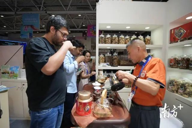 罗沛贤是深圳文化博览会的常客,是省级非遗项目罗氏柑普茶的第六代传承人。和往年一样,他冲泡的柑普茶吸引了国内外众多商家和观众品尝。孟加拉国的一位商人拿起一杯柑普茶,喝了一口。芬芳的柑普茶让他大赞:“Very good(很好)!"