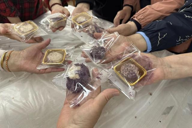 在现场,居民们分工合作,撒上椰子粉、压制模具、包装和包装...动作逐渐熟练。不用一会儿,一盒色彩鲜艳、纹理精美的山药紫薯饼就做好了。居民们热情地介绍了自己的健康妙招和养生经验:用薄荷叶浸泡在水中消暑,用茯苓茶安神助眠...笑声和笑声之间,邻居的友谊悄然升温。