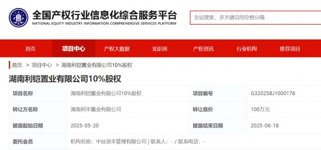 湖南利华置业10%股份挂牌转让利铠置业,底价100万元