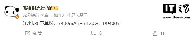 IT 世家 5 月 23 每日新闻,博主 @熊猫很秃然 今天爆料说,小米 REDMI K80 配备天玑的至尊手机 9400 Cpu、7400mAh 电池、120W 快充。