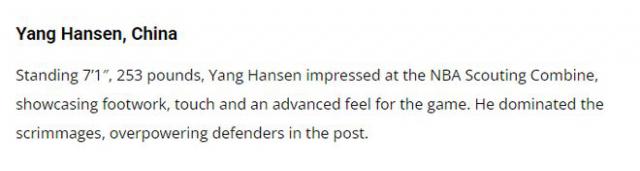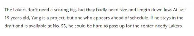“湖人队不需要一个能够得分的大个子,但是他们急需内线的高度。年仅 19 年杨瀚森是一名潜力球员,他的发展似乎超出了预期。假如他没有退出选秀,并且在第一名。 55 对急需中锋的湖人来说,顺位还没有被选中,很难错过他。”
