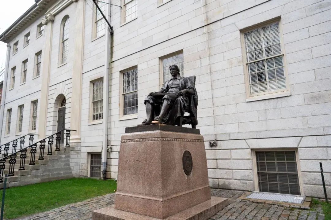 这张2024年4月20日在美国马萨诸塞州剑桥拍摄的资料照片显示了哈佛大学创始人约翰·哈佛的雕塑。新华社记者刘杰 摄