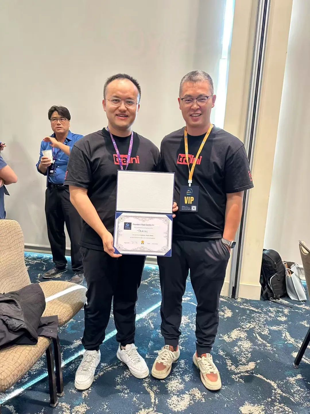 在美国华人科技组织华源科技协会,孙邻家(右)和合伙人Jason(左)(HYSTA)Traini在2024年的年会上获得了该协会颁发的深受用户喜爱的奖项。(Audience Choice Award)