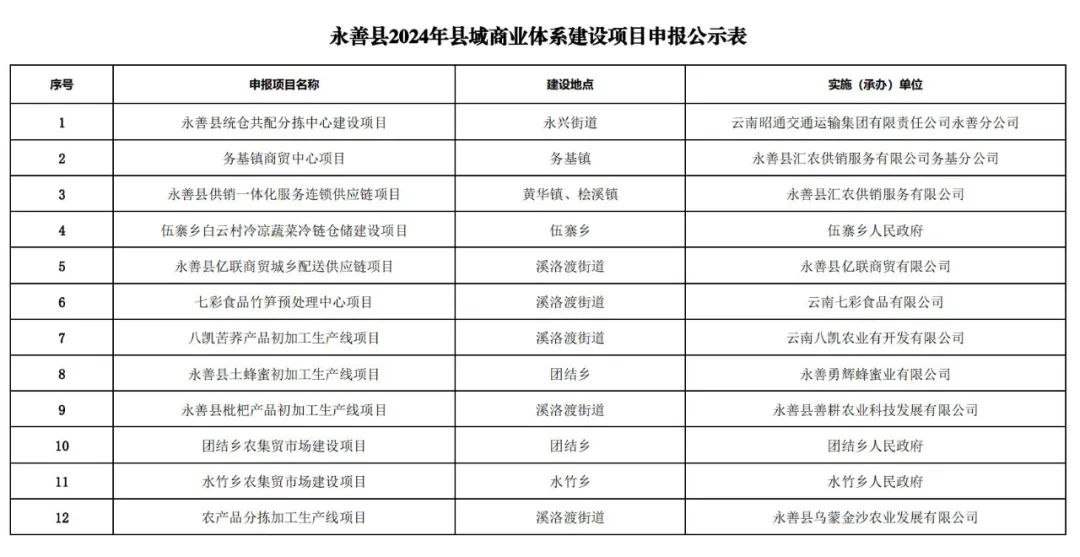 按照云南省商务厅的规定 云南财政厅 云南省农村振兴局关于做好2024年县区商业建设行动和资金管理工作的通知(云商市建设〔2024〕12号)经实施单位主动申报,相关部门联合审查,现公示永善县2024年县区商业体系建设初审项目,接受社会监督。
