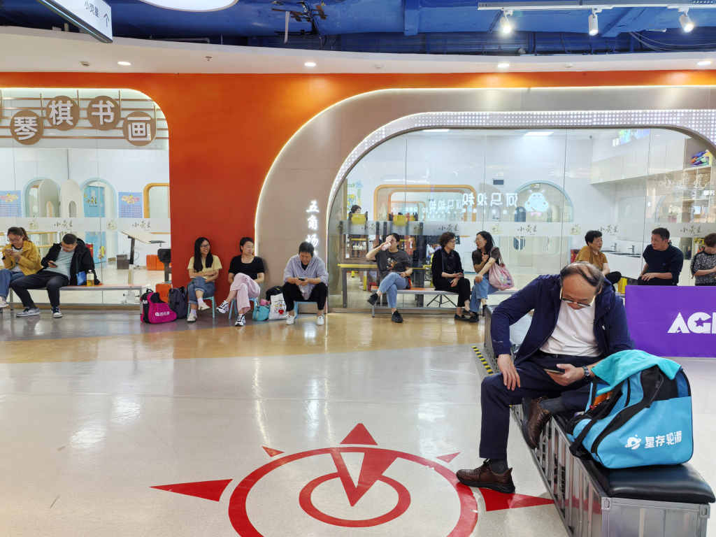 五角场万达滑雪店旁边的儿童教室和轮滑场外挤满了厌倦刷手机的父母。