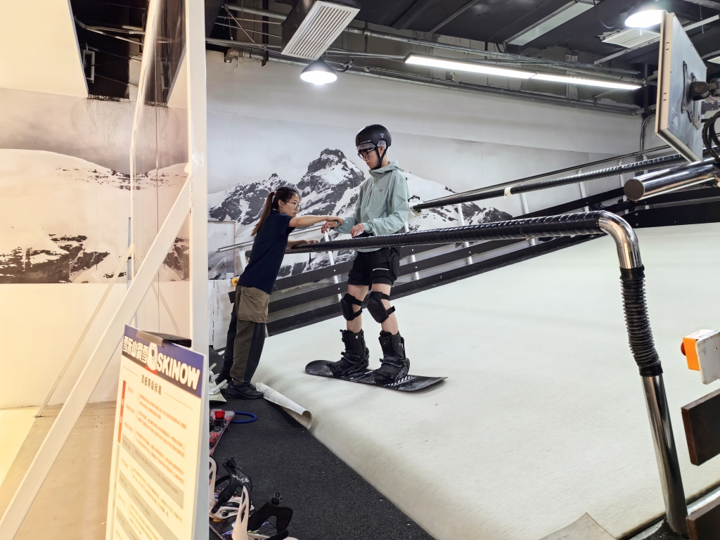 万达在五角场开始单板训练的学生。对于初学者来说,店员和教练都不需要穿护具和雪具。