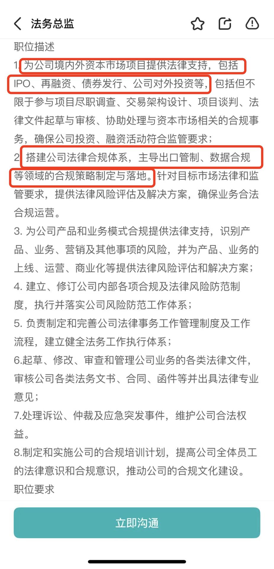 除此职位外,智源机器人还同时释放了法律总监的职位,为企业境内外金融市场项目提供法律支持,包括IPO、再融资等,主导出口管制、数据合规等工作,要求候选人具备国内外投融资经验等。