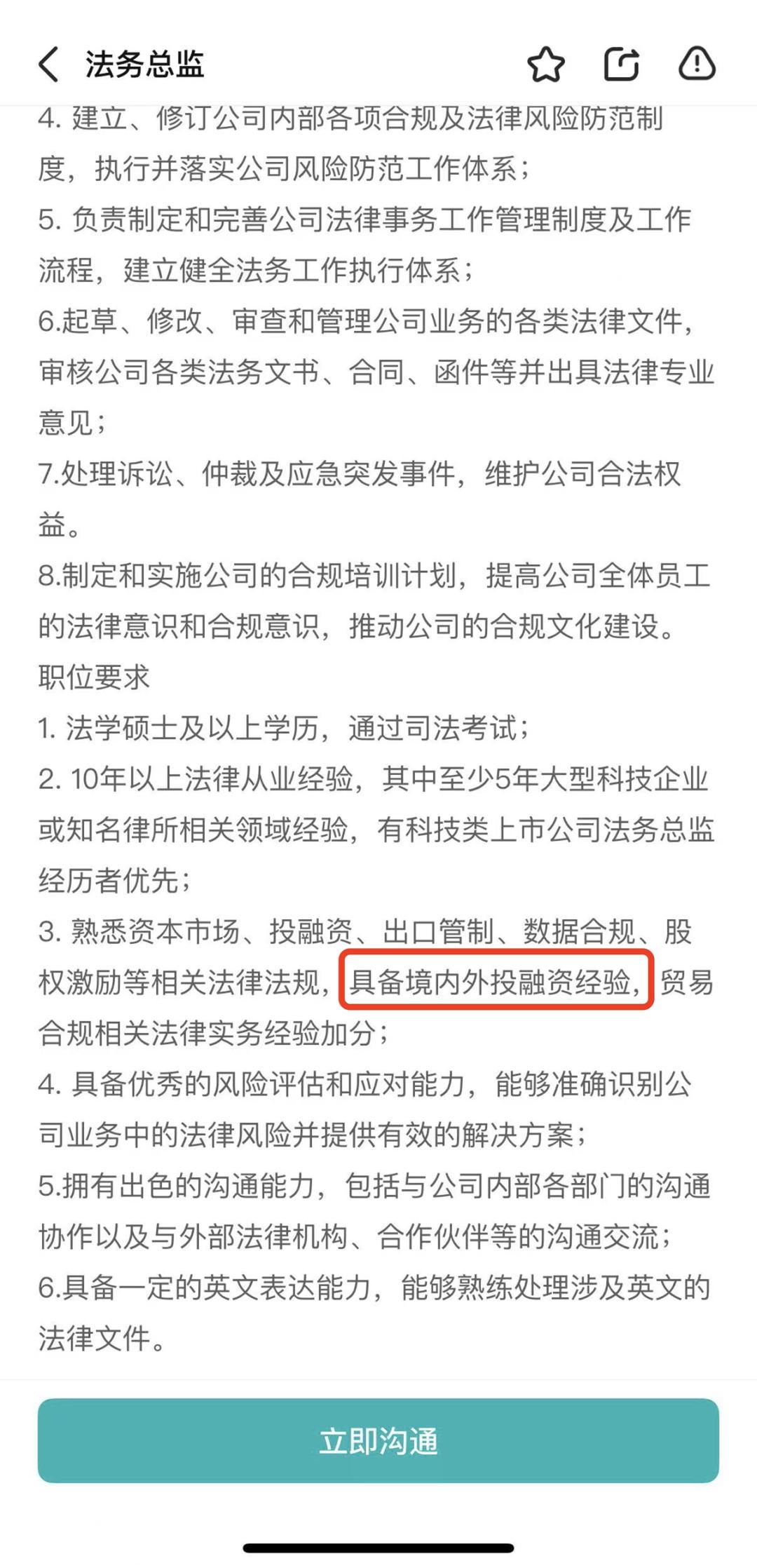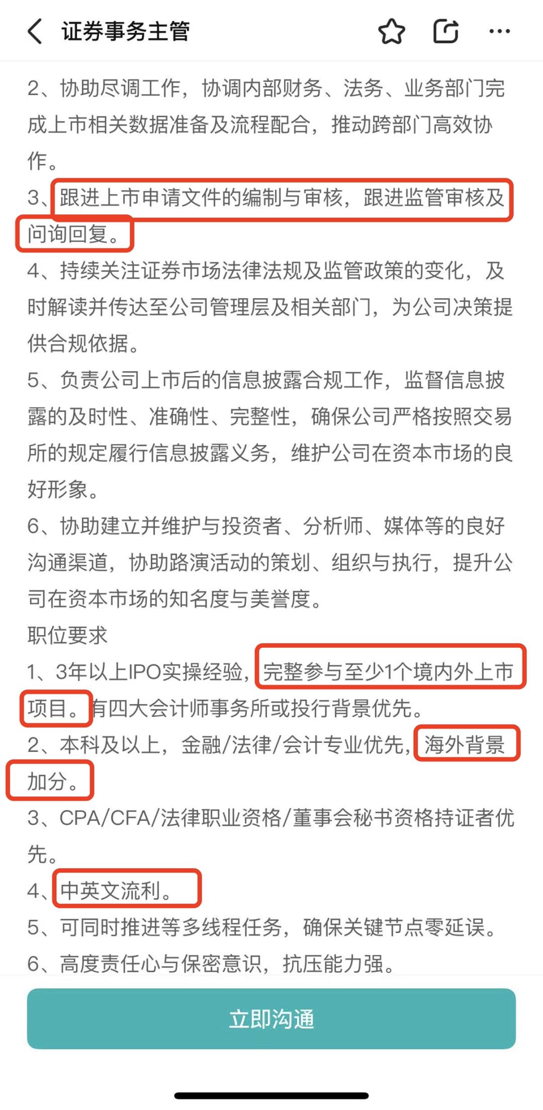 除常规相关资质和四大或投行经验外,任职要求,还要求候选人完全参与国内外至少一个上市项目,中英文流畅,海外背景加分。