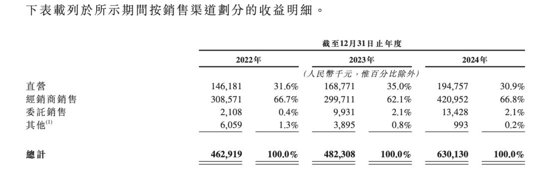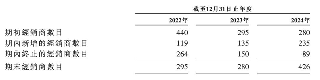 经销商的数量显著扩大,2022年期末有295家经销商,2024年期末有426家经销商。