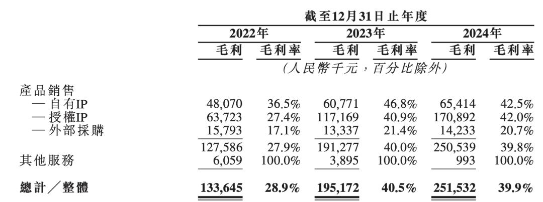 根据招股书,公司自有IP销售收入在2022年为1.32亿元,在2023年为1.3亿元,在2024年为1.54亿元。2023年销售份额从28.5%下降到1.54亿元。2024年的24.5%。自有IP销售比例持续下降。