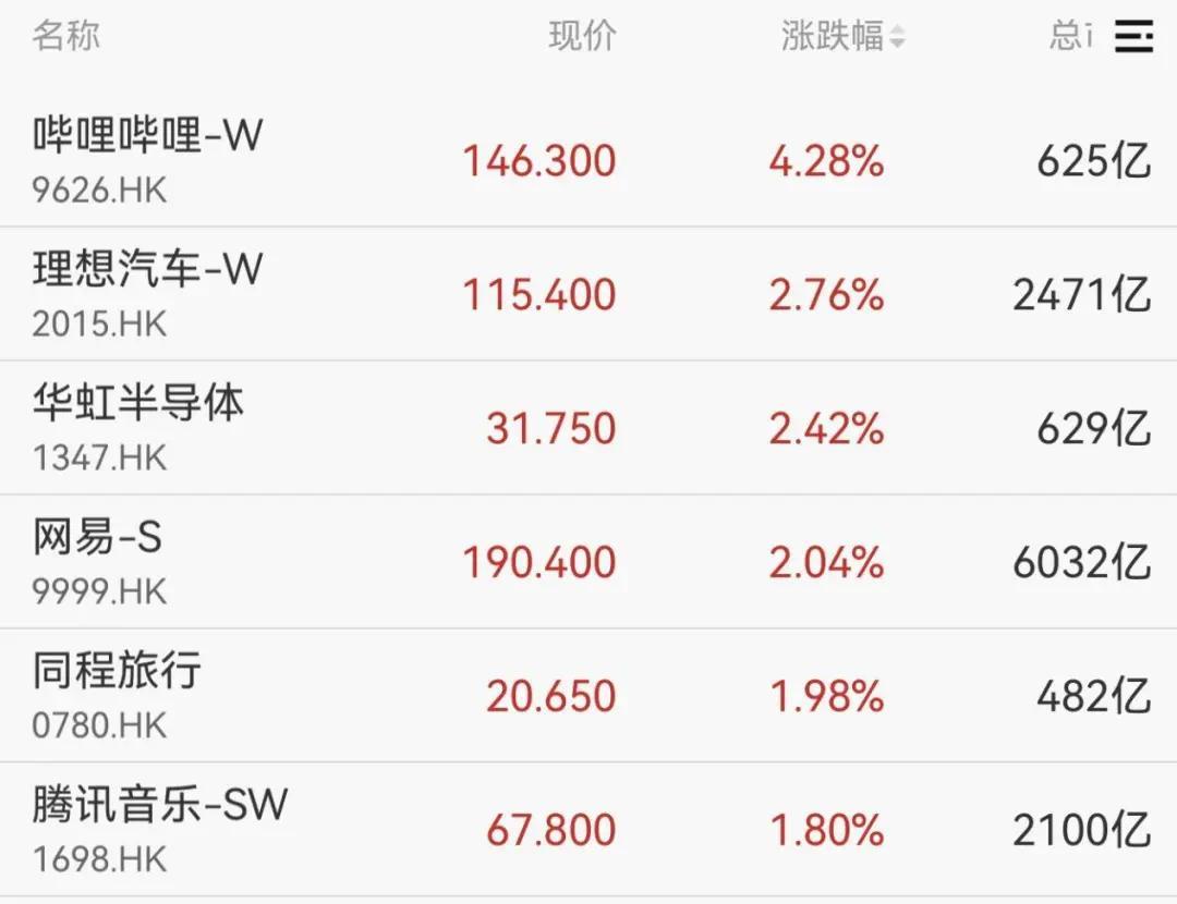 在港股方面,三大指数全部上涨,哔哩哔哩上涨超过4%,理想汽车、华虹半导体、网易等也随之上涨。