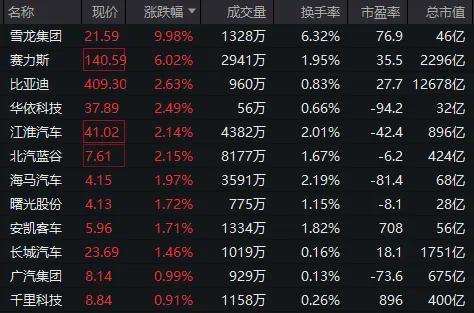 整车股震荡拉涨,比亚迪创历史新高,雪龙集团涨停,赛力斯,江淮汽车,北汽蓝谷等。