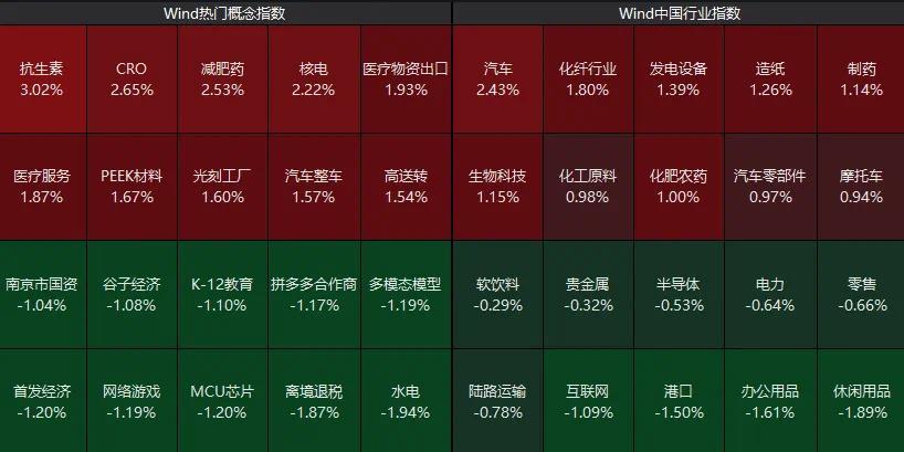 从板块来看,医药板块波动较大,汽车、核电、化工板块活跃;港口、网络游戏、首发经济等概念股波动调整。
