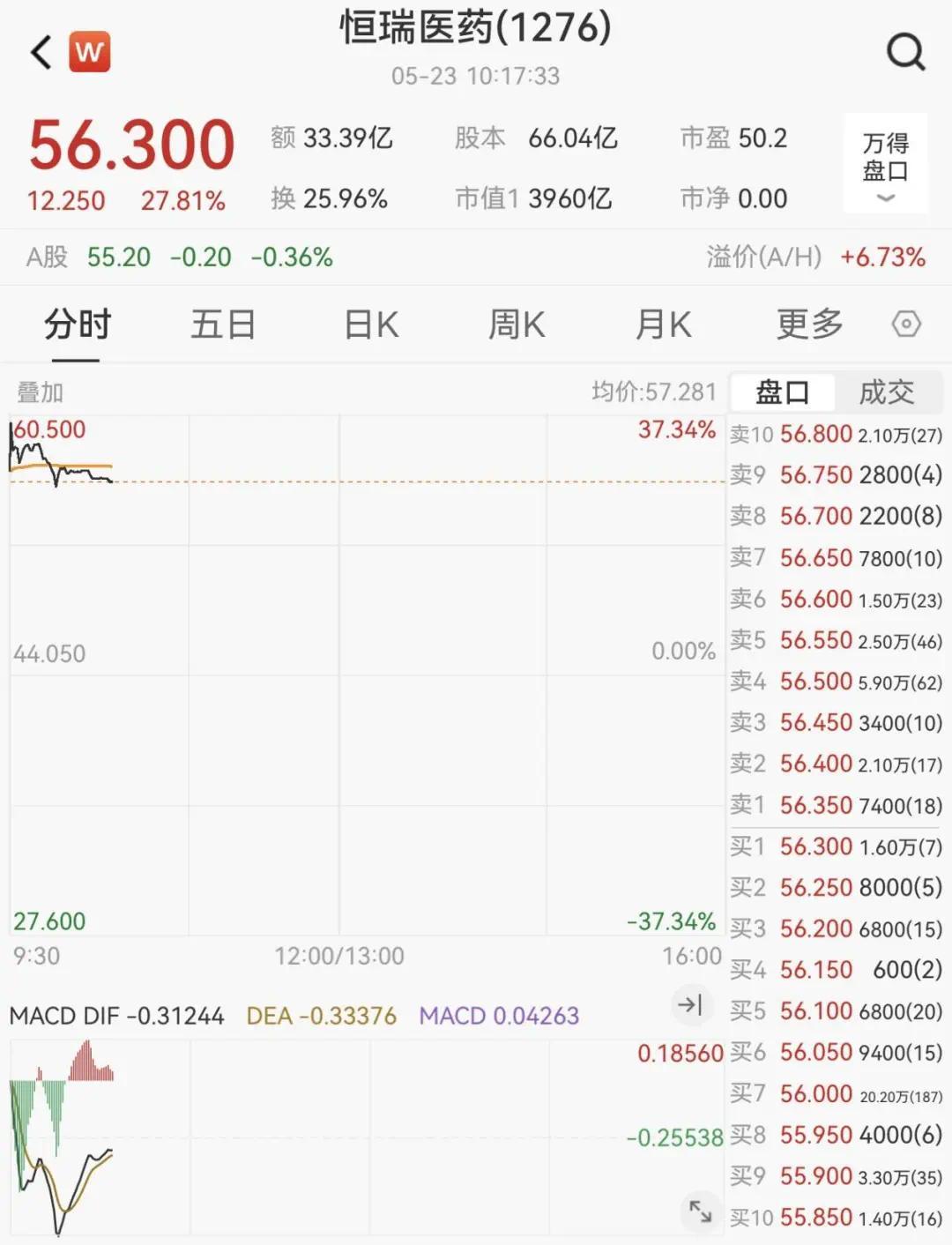 在恒瑞医药港股上市的第一天,盘中一度涨幅超过30%,最新总市值达到3960亿港元。