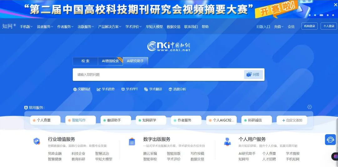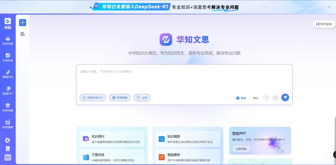 既能兼顾传统的文献检索功能,又能基于知网华知模型提供AI搜索整理,还能让AI帮你阅读文献,整理研究。可能大家都离开校园或者学术岗位太久了,现在登录知网官网可以跳转到华知文思的直接聊天界面: