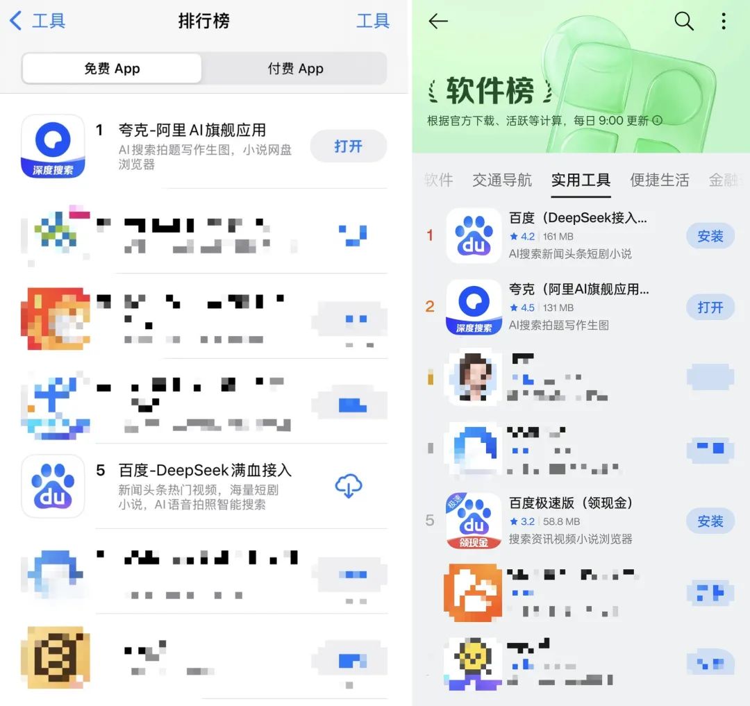 首先,中途杀出的夸克,依靠阿里AI搜索独生子弹的光环,疯狂迭代更新技术,以及小而精、全过程无广的优秀感受,在不经意间吸引新粉,长期占据各大软件店工具榜榜首,与中国在线搜索巨头百度一起,甚至在iOS上获得Apple。 Store工具列表完全挤出了百度: