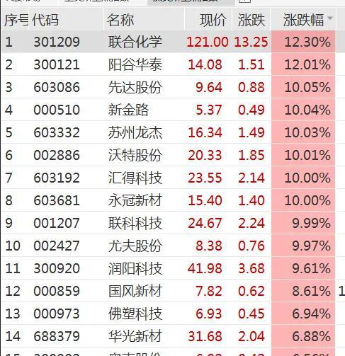 最近化工板块继续活跃,多芯呈现翻倍趋势。截至中午收盘,联合化工、阳谷华泰涨幅超过12%,先达股份、新金路、苏州龙杰等多只股票涨停。