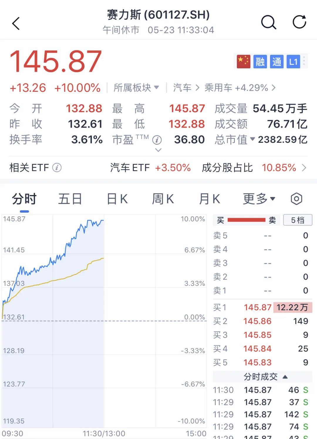 汽车股表现强劲。截至中午收盘,德迈仕涨停20%,汉马科技、动力新科技、赛力斯、北特科技等多只股票涨停;比亚迪涨幅超过4%,股价再创历史新高。值得一提的是,截至发稿时,赛力斯成交额76.71亿元,在a股排名第一。