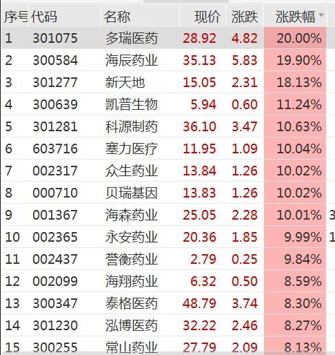 在恒瑞医药港股上市首日大幅上涨的刺激下,a股医药板块爆发。截至中午收盘,多瑞医药有限公司涨停20%,海辰医药有限公司涨停20%,新世界、科源医药涨停10%以上,众生医药、贝瑞基因、海森医药等多只股票涨停。