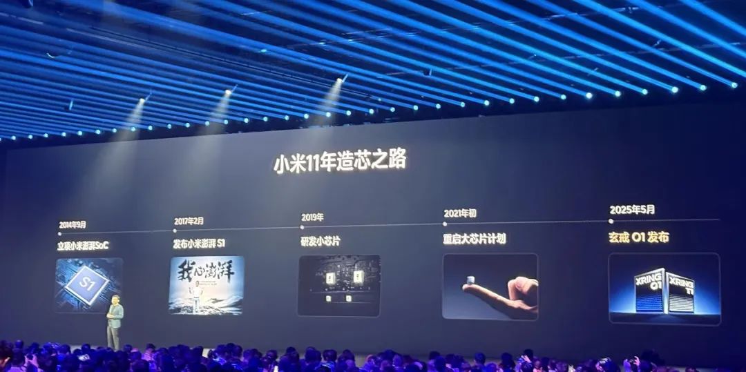 小米创始人雷军站在舞台中央,在聚光灯的注视下,宣布小米自主研发的首款手机SoC芯片“玄戒O1”正式发布。