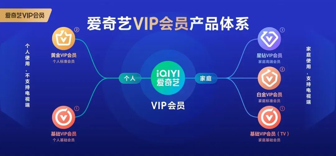 现在爱奇艺的会员产品分为基础、标准、高档三个层次,有五种会员产品,包括个人基础会员(带广告)、黄金会员和基础电视会员、白金会员和面向家庭的星钻会员。其中,黄金和白金会员作为个人和家庭的标准产品,是爱奇艺客户订阅的主要产品。