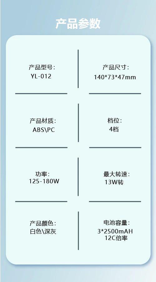 2、13 万高转速风速可称为风暴级的科力尔电机;特斯拉同款电池,续航时间长;军用铝合金风扇叶片,耐用耐用。