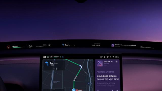 最令人敬佩的内饰是行业首次量产的小米长空屏全景显示,可以让你拥有一种 "航空舱" 现代感。但是这一全景有些内容会直接扩展到副驾驶位置,对驾驶员来说可能需要一些适应时间。它提供仪器,多媒体,时钟天气,地图导航等等 5 类信息卡,所以副驾驶屏和方向盘前面的仪表屏可以省略,前面看起来更干净。同时,当用户进入前排时,他们会感到空旷舒适。官方表示,屏幕上的内容将达到零重影、烈日不透光、背光清晰可见的效果。
