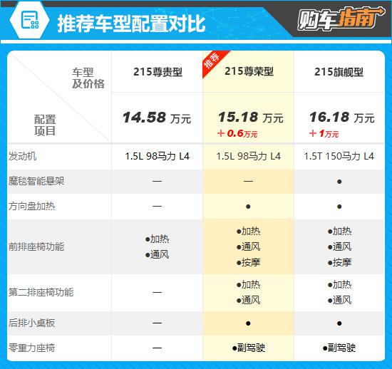 总的来说,推荐车型比较好。 215 尊贵型增强了方向盘加热、前排座椅按摩、第二排座椅加热 / 通风,后排小桌板,副驾驶零重力座椅功能,可以大大提升用车体验,只需增加售价即可。 0.6 一万元,性价比极高。