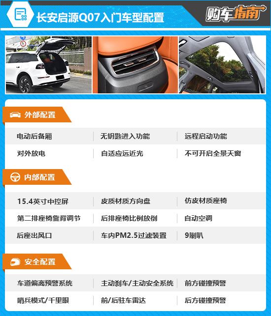 长安启源 Q07 入门级车型配备性能还可以,配备电动后备箱,无勺进入功能,后排座椅比例放下,自动空调,前排。 / 后驻车雷达,哨兵模式 / 常用功能,如千里眼。同时,它还支持放电,为消费者提供更多的生活习惯。之所以不推荐这款车型,主要是因为选择性价比更高。