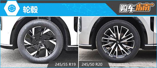 轮毂方面,145 豪华版、145 尊贵型、215 尊贵型标配 19 英尺式低风阻轮毂, 245/55 R19 普通轮胎;215 尊贵型和 215 旗舰型标配 20 运动轮毂,配备英尺 245/50 R20 普通轮胎;215 旗舰 PLUS 同样配置 20 英尺运动轮毂,但选用 245/50 R20 全新的米其林浩悦 4 代 PRIMACY4 车胎。