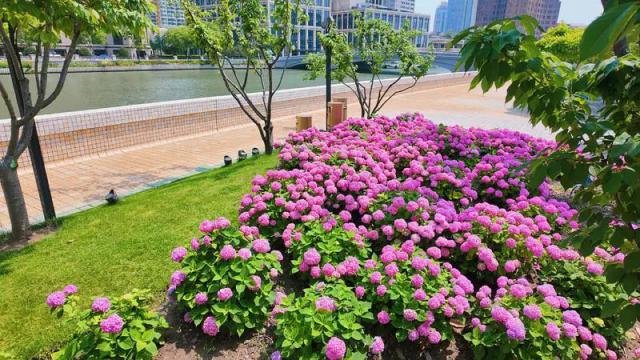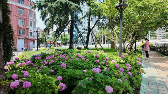 由于初夏气温逐渐升高,苏州河沿岸又迎来了一年一度的绣球花盛开季节,大约是一年一度。 400 绣球花盛开,蓝色的梦想,粉色的温柔,紫色的优雅,白色的纯净。各种绣球花在这里相互辉映,吸引路人驻足观看打卡,为城市滨水空间增添了一丝灵动。