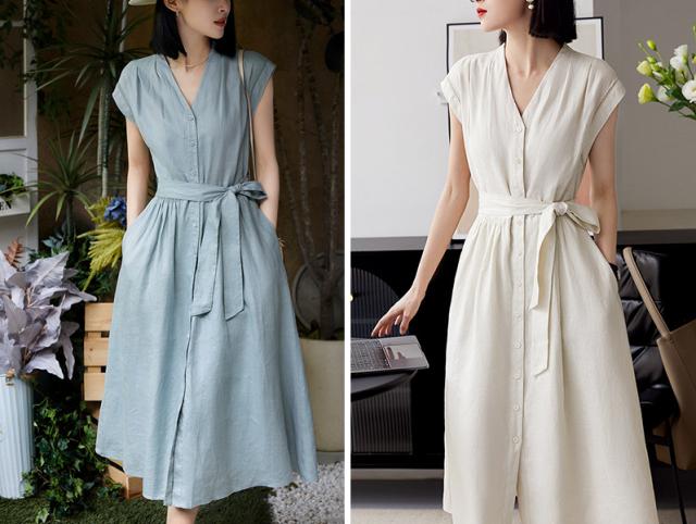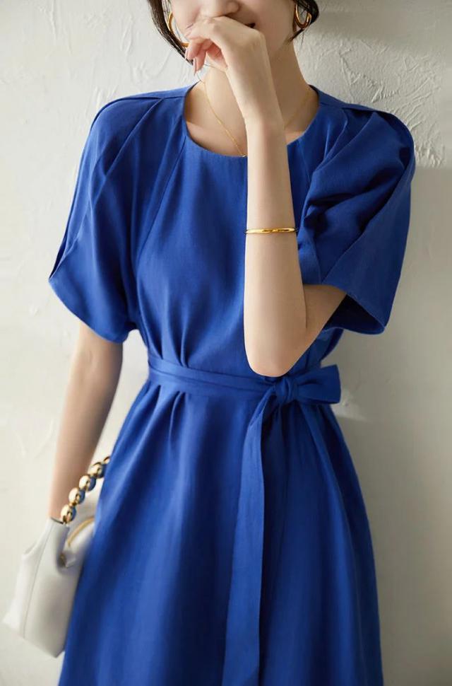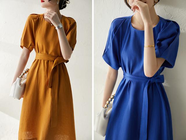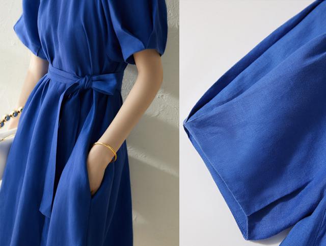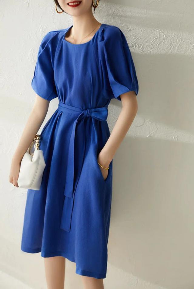 三是亚麻花蕾袖紧腰显瘦圆领连衣裙