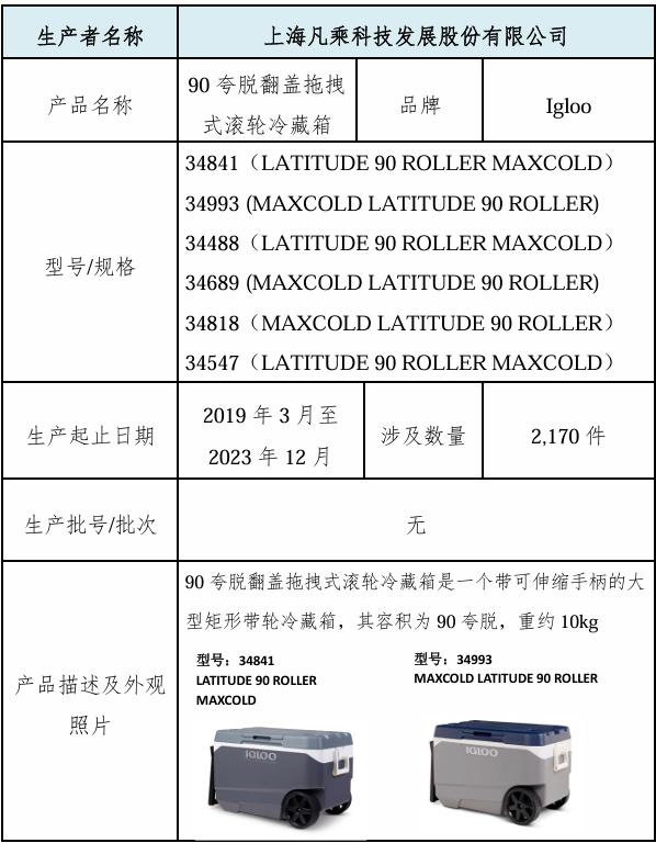 据市市场监管局介绍,上海凡乘科技发展有限公司自上海市 2025 年 5 月 23 日至 2025 年 8 月 22 日召回 2019 年 3 月至 2023 年 12 月制造的 Igloo 牌 90 夸大翻盖拖拉滚筒冷藏箱,共计 2170 件。详细↓